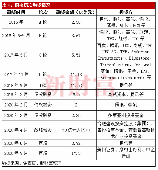 蔚来从2015年6月开始规模融资,至2020年9月,共计募资66.25亿美元,以及70亿元人民币,折合人民币大约514亿元,成为造车新势力中的融资扛把子(表4)。