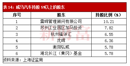 上海证监局已公布威马上市辅导备案报告,辅导机构是中信建投,计划登陆科创板。威马实际控制人是沈晖,直接加间接持股比例为16.57%;代表百度持股的杭州福祥汇,持股比例6.55%,多家国资持股5%以上(表14)。企查查显示,百度还直接持股3.53%,合计持股比例超过10%,是沈晖外的最大机构股东。红杉、腾讯各自持股约1.54%。