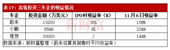 蔚来C轮融资时,百度以1亿美元获得2574万股,IPO时收益率为61%。百度(包括爱奇艺)和蔚来还结成战略合作关系。若未减持,至11月6日,蔚来的战略投资者百度账面净收益为9.9亿美元,收益率为990%。