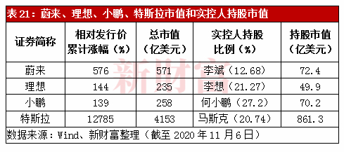 反观李想、李斌和何小鹏,凭借各自控制的公司上市,身价暴涨,在50-70亿美元之间(表21)。李斌持股比例最少,但蔚来市值超过小鹏、理想市值总和,使其身家得以超过李想,和何小鹏相当。