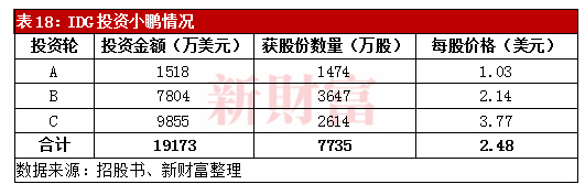 IDG投资蔚来,金额要少很多,B轮500万美元,C轮100万美元,总计600万美元,获得207万股,持股成本为2.9美元。蔚来IPO时,IDG收益率为115%。