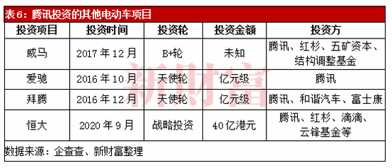 小鹏、理想(车和家)、蔚来、威马成立时间集中在2014-2015年;爱驰、拜腾成立于2017年前后。大机构都有投赛道习惯,新能源车赛道上,腾讯选择了蔚来、威马、恒大、爱驰和拜腾5个选手(表6)。虽没有详细出资信息,但腾讯在爱驰、拜腾天使轮、威马汽车B+轮进入,属于早期投资,总金额应有限;恒大汽车40亿港元融资,腾讯出资额应该不少。