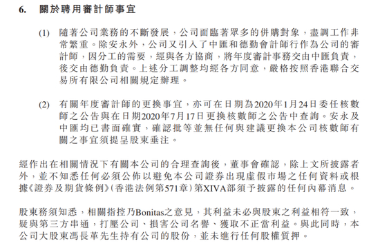 公司回应两点如下:1) 随着公司业务的不断发展,公司面临着众多的并购对象,尽调工作非常繁重。除安永外,公司又引入了中汇和德勤会计师行作为公司的审计师,因分工的需要,经与各方协商,将年度审计事务交由中汇负责,后交由德勤负责。上述分工调整均经各方同意,严格按照香港联合交易所有限公司相关规定办理。