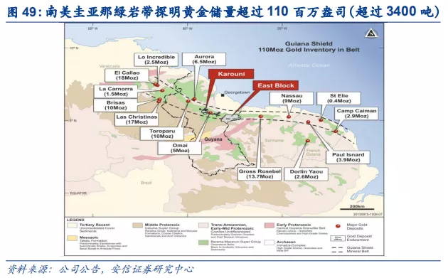 两点值得注意,一是目前黄金储量的估算相对谨慎。早先Aurora金矿的黄金储量曾约118吨,后调整了部分技术参数后储量有所下降,目前的黄金储量/资源量约40%,采用的金价假设约1200美元/盎司,整体估算还是比较谨慎。二是矿带周边黄金资源丰富,增储潜力大。公司项目位于圭亚那绿岩带,拥有15块独立的勘探资产。该矿带拥有上亿盎司的各种金矿床,周边有El Callao(金储量约560吨)、Las Christinas(金储量约529吨)、Gross Rosebel(金储量约426吨)等大型金矿,周边勘探潜力很大。