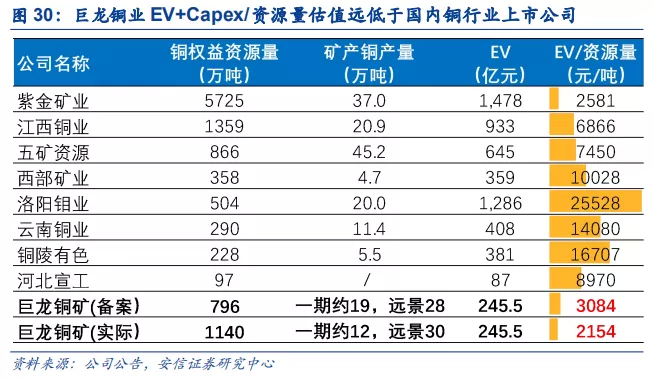 从EV+Capex/资源量看角度看,考虑到驱龙铜矿接近投产,但还需部分资本开支,巨龙矿业EV+Capex约为245.5亿元,对应EV+Capex/资源量(备案)约为3084元/吨,EV+Capex/资源量(实际)约为2154万吨,均小于国内上市铜企。