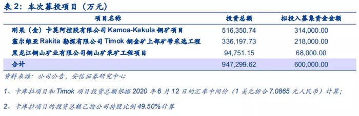 二是进一步扩大金、铜、锌矿产品生产规模,提升公司盈利能力。KK项目预计2021年7月投产,预计达产后年平均铜产量约30.7万吨;Timok项目预计2021年6月投产,年均产铜约 9.14万吨,金2.5吨,且有超预期的可能;铜山采矿工程项目将进一步降低矿石生产成本,提高盈利能力。经公司测算,本次募投项目建成投产后,卡库拉项目达产年平均实现销售收入14.1亿美元,年均创造税后净利润6.2亿美元;Timok项目达产年平均实现销售收入5.4亿美元,年均创造税后净利润2.7亿美元;铜山项目达产年平均实现销售收入4.23亿元,年均创造税后净利润1.2亿元。随着募投项目的顺利实施,公司将增加新的利润增长点,净资产规模将会扩大,资产负债率进一步下降,有利于公司未来经营规模的扩大及利润水平的增长,使公司财务状况进一步得到优化。