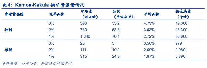 KK铜矿位于刚果金,拥有无与伦比的资源基础。Kamoa铜矿坐落于刚果(金),处在赞比亚-刚(金)铜钴成矿带上,根据2020年2月卡莫阿矿段最新的资源估算,以及卡库拉矿段2018年11月10日生效的资源估算结果,以边界品位1%计算,卡莫阿-卡库拉铜矿控制级别的铜金属资源量为3,800万吨(13.87亿吨@Cu2.74%),推断级别的铜金属资源量为569万吨(3.39亿吨@Cu1.68%),铜金属资源量合计为4,369万吨,比2018年年报披露数据增加154万吨。