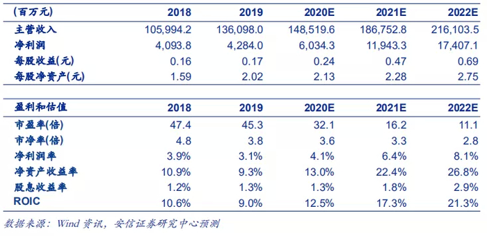 预计2020-2022年公司归母净利润CAGR达到69%。基于以上假设,我们预计公司2019-2022年营业收入分别为1,485.2、1,867.5、2,161.0亿元,对应归母净利润分别为60.3、119.4、174.1亿元,归母净利润复合增长率高达69%。