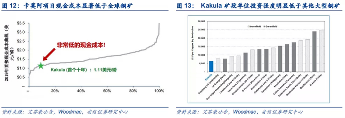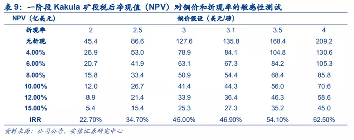 三是单位投资强度显著低于其他大型铜矿,盈利能力突出。根据Kakula可行性研究报告,项目建成投产后,实施主体卡莫阿铜业公司达产年平均可实现销售收入14亿美元,年均创造税后净利润6.19亿美元,内部收益率(税后)为40.61%,投资回收期为4.96年(税后含建设期),具有较好的经济可行性。Kamoa-Kakula 2019 PEA显示三阶段项目的净现值达到100亿美金,IRR高达40.9%。