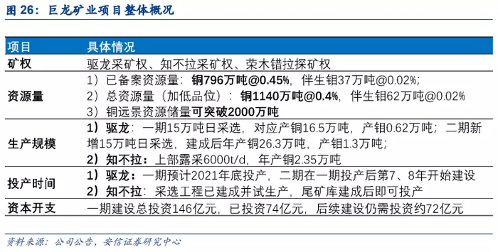 巨龙铜矿业一期可年产铜约19万吨,远景可产铜约28万吨。知不拉矿区该项目采选工程已基本建成并进行试生产,预计2021年贡献产量。经公司研究调整,项目投产后上部露采规模 6,000t/d,前8年为露采,年产铜 2.35 万吨;下部地采规模 3,000t/d,服务期为第 9~15 年。