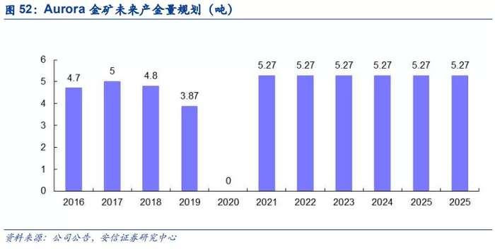 因受卫生事件和资金短缺影响,目前处于停工状态。Aurora矿山于2016年实现商业化生产,2016-2019年黄金产量分别为4.7吨、5吨、4.8吨及3.87吨。Aurora矿山自投产以来都是露天开采,根据规划将从2021年转入地下开采。地采开拓工程于2018年开始实施,因受卫生事件和资金短缺影响,目前处于停工状态。