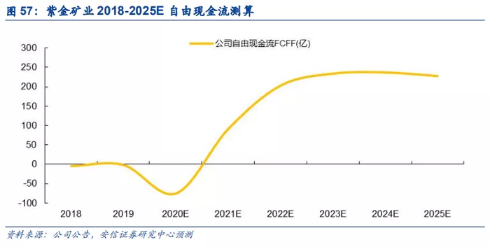 预计未来公司自由现金流维持较高水平,为公司下一轮扩张周期积蓄力量。考虑到2018~2020年是公司资本开支大年,公司自由现金流相对处于负值区间。随着公司未来关键铜金项目逐渐投产,公司经营性现金流将显著改善,结合公司大额资本开支进度已经过半,预计未来公司自由现金流将非常充沛,据我们测算或将维持在200亿量级左右,为公司下一轮扩张周期积蓄力量。