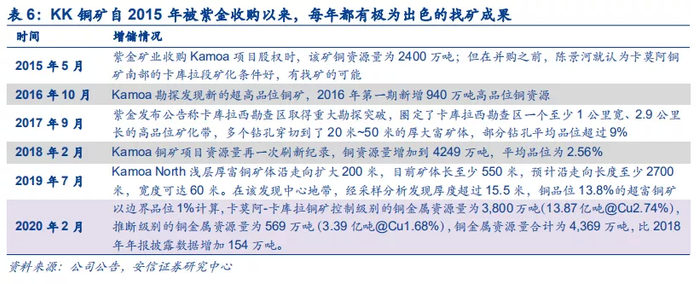 铜资源量从2015年收购之初的2400万吨,截至2020年2月提升至4369万吨,增幅高达82%,目前矿体边界仍未封闭,仍存增储空间。2015年紫金矿业收购Kamoa项目时,该矿铜资源量约为2400万吨,董事长陈景河一直认为卡莫阿铜矿有广阔的找矿前景,也正是从2015年开始,KK铜矿每年都有极为出色的找矿成果。