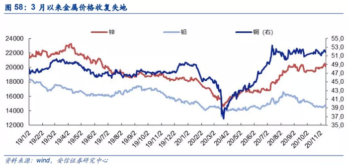 卫生事件影响逐步淡化,金属价格中枢回升。前三季度在卫生事件背景下实现了可观的业绩。2020年3月19日,国内铜、铅、锌现货价格一度跌至3.76万/吨、1.33万/吨、1.43万/吨,创出近4年新低,较低的金属价格一度压制公司全年业绩预期。截至2020年11月12日,国内铜、铅、锌现货价格反弹至5.19万/吨、1.48万/吨、2.02万/吨,由低点回升约38%、11%、41%,3月底金属价格大幅回落的影响基本消除。