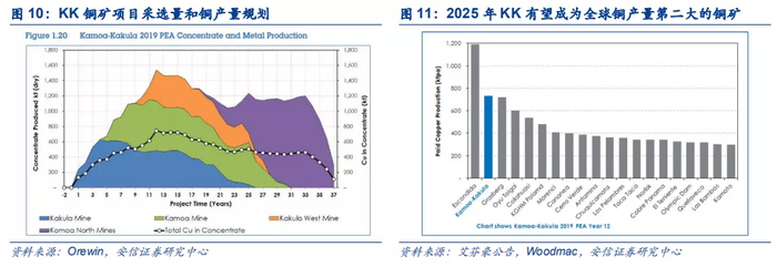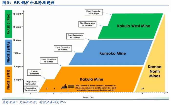 KK项目分三阶段建设,完全达产后峰值可年产铜约74万吨。根据最新的PFS和PEA报告显示,KK项目分为建设分为三阶段,第一阶段主要是开发Kakula矿段, Kakula入选矿石品位可以高达7-8%,矿石连续性好,开发难度低,所以先行开发,二、三阶段分别是Kansoko和Kakula-West。三期项目设计年处理量均为600万吨,达产后总处理量达到1800万吨/年,前10年平均产铜38万吨,第12年产铜达到74万吨,Woodmac预计2025年KK项目将成为全球铜产量第二大的铜矿。