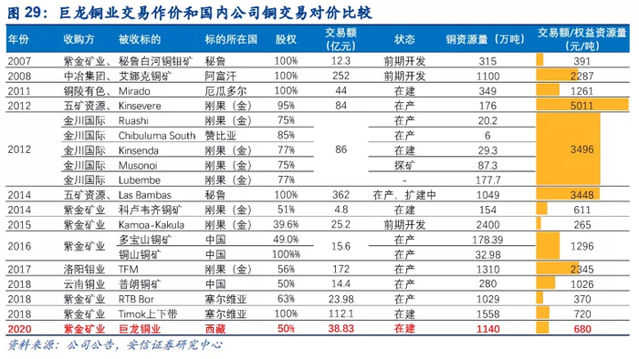 从股权作价/资源量角度看,巨龙铜矿100%股权作价约77.5亿元,对应交易对价/权益资源量≈680元/吨,对比kamoa、Commus这种明星项目估值略高,但比多宝山项目略低,也低于其他公司在铜资产方面的收购对价。