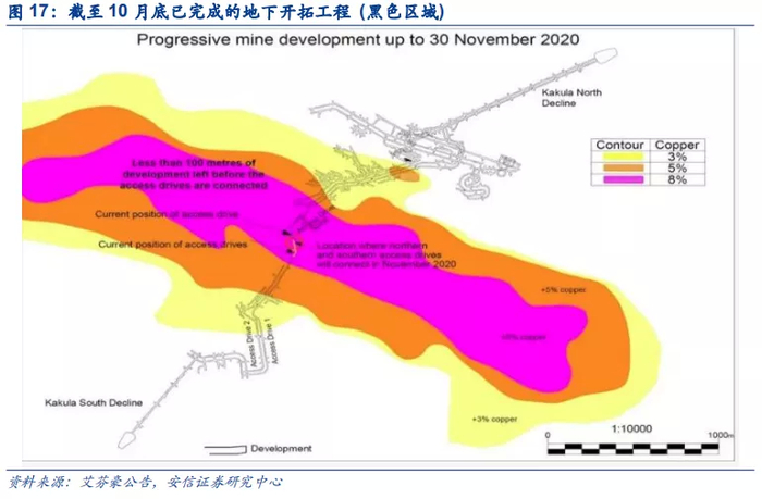 2020年10月20日,艾芬豪矿业宣布卡库拉选矿厂预计于2021年7月实现首产。早在2017年11月,Kakula铜矿斜坡道工程正式开工,2018年7月,安信有色团队实地调研KK铜矿,当时斜坡道已在年初打到矿体,开始建矿。