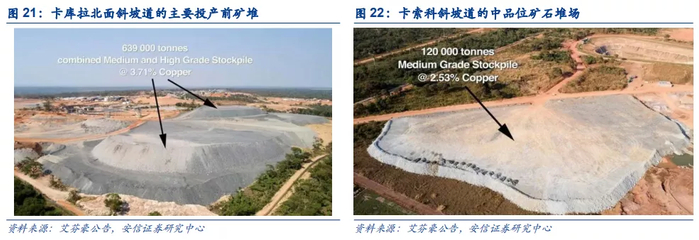此外,项目还有两个额外的投产前矿堆,分别位于卡库拉南面斜坡道 (约67,000 吨高品位矿石,铜品位5.05%以及171,000吨中品位矿石,铜品位2.62%) 和卡索科斜坡道 (约120,000吨矿石,铜品位2.53%)。