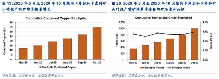 项目投产前的地表堆场矿石储备充足,矿量即将加速堆放。艾芬豪矿业宣布采掘班组于10月份在卡库拉和卡索科矿山共采掘了19.4万吨矿石,相比9月份高出48%。目前已储备了约100万吨高品位和中品位矿石,铜品位约3.47%。迄今为止,在卡库拉和卡索科矿山已完成了大量投产前的开拓工程,使项目于10月开始大大提升地表堆场的矿石量,且矿石的品位将会显著增加。