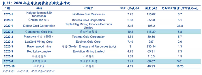 我们的统计数据表明,2020年以来全球主要黄金并购交易的吨储量估值范围大约在1.3-31.8百万美元/吨之间,此次紫金矿业收购大陆黄金的交易对价8.8百万美元/吨,处于该范围的较上沿,但考虑到当时大陆黄金武里蒂卡项目处于即将投产阶段,交易对价具备合理性。