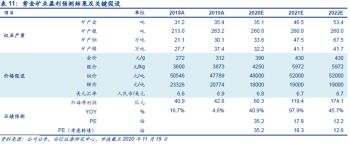 2020年是公司的建设年,武里蒂卡金矿已于二季度投产并形成小规模盈利,卡库拉铜矿采选项目、塞尔维亚紫金铜业、Timok铜金矿项目,巨龙铜矿、陇南紫金李坝金矿改扩建项目超预期推进;波格拉金矿项目峰回路转。我们预计2020-2022年公司矿产铜、金权益产量CAGR约为41.8%、23.4%。