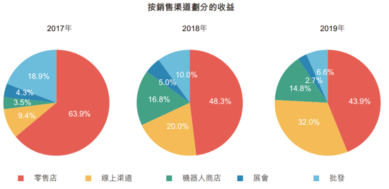 在销售渠道上,泡泡玛特主要依靠线下零售店、线上、机器人商店、批发和展会,线下零售店、线上渠道和机器人商店合计贡献了超过9成的收入。其中,机器人商店在2017年推出,类似食品饮料的自动贩卖机,顾客在机器上面选择购买对应的系列盲盒。机器人商店主要投放在购物中心以及人流较高的如地铁站等位置,在租赁费、人工费和维护成本方面比线下零售店要低,并且能够帮助泡泡玛特迅速渗透零售店没有覆盖的区域。