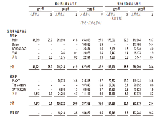根据泡泡玛特的招股书,截至今年上半年,泡泡玛特共运营着93个IP,其中IP又分为三个类别:通过收购或内部团队设计开发的自有IP(Molly、Dimoo等);由合作艺术家创作,拿到独家授权的独家IP(PUCKY、The Monster等);由知名IP提供商非独家授权的其他IP(米老鼠、小黄人等)。