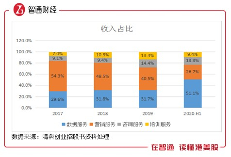 该公司四大业务中,数据服务和营销服务是核心业务,2020年上半年收入贡献分别为51.1%和26.2%,其中数据服务收入贡献逐年提升,今年上半年较2017年提升了21.5个百分点,主要为定制报告的需求持续提升。营销服务业务贡献于今年上半年稍有下降,主要因为线下品牌及定制活动减少,这也是该公司收入下滑的主要原因。
