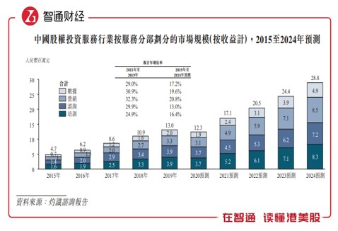 从行业来看,中国股权投资服务行业处于早期且快速成长的阶段,2019年市场规模为130亿元,近五年复合增长率达到29%,而数据服务、营销服务、咨询服务及培训服务市场规模分别为20亿元、33亿元、39亿元及39亿元,近五年复合增长率分别为29%、30.9%、32.3%、29.9%及24.9%。