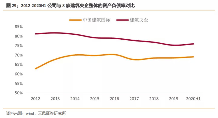 公司负债水平较为健康,多年维持在70%以下,截至2020年6月30日,资产负债率为69%,而行业内其他央企整体资产负债率为75.83%。按照国资委目前确定的合理资产负债率标准(工业企业为70%,非工业企业为75%),目前其他建筑央企的资产负债率仍有超标,预计未来央企降杠杆工作依然是央企考核的重要标准,但公司降杠杆压力相对较小,具有较好的财务张力。