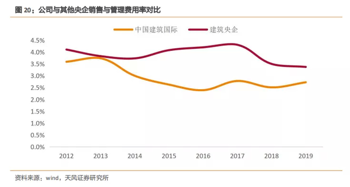 此外,公司设有薪酬委员会,人力资源部所草拟的集团薪酬政策均需提交委员会,薪酬委员会根据才干及技能、知识水平、表现及贡献、集团整体表现等确定员工薪酬,一定程度上控制企业的管理费用。凭借市场化激励以及管理优势,公司在成本控制方面表现突出。自2012年以来,公司的销售与管理费用率均低于行业内其他央企的平均水平,2017-2019年分别为2.78%、2.51%、2.73%,而央企平均值分别为4.31%、3.50%、3.37%。凭借完备的管理体制,预计公司在未来一段时间内都能获得高于行业内其他央企平均水平的净利润率。