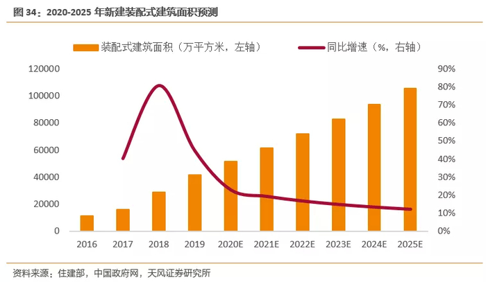 中国内地方面,在劳动力紧缺、环保趋严的背景下,2016年国务院颁布《关于大力发展装配式建筑的指导意见》,大力发展装配式建筑,提出到2025年使装配式建筑占比达到30%,至此装配式建筑进入快速发展期。根据住建部数据,全国新建装配式建筑面积从2016年的1.14亿平方米增长至2019年的4.2亿平方米,年均复合增速高达54.45%。2019年装配式建筑面积占新开工比例为13.4%,距离2025年30%的目标仍有较大差距。假设未来每年新建建筑面积增速为2%;2025年装配式建筑面积占比参考下限值30%,期间按线性插值计算,我们预计2025年新建装配式建筑面积将达到1.05亿平方米,年均复合增速为16.66%,市场空间依旧广阔。