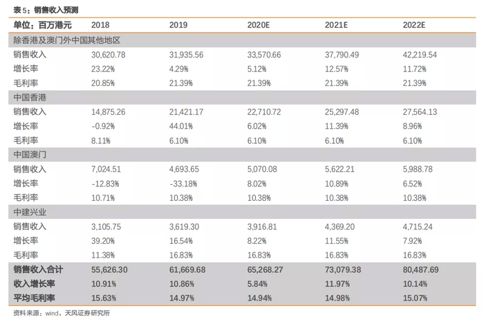 假设1:内地业务方面,短期来看,公司为优化经营结构使业绩和订单有所放缓,加之卫生事件对国内业务也造成一定冲击。中长期来看,公司将提升动态回报率、改善ROE作为考核指标,未来短周期项目是业务主流,有助于提升项目周转和资金使用效率。目前公司在手订单依然充足,为业绩提供持续保障,我们预测中国内地2020-2022年收入增速分别为5.12%、12.57%、11.72%。