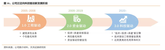 2020年开始公司提出新战略,通过“技术+投资+承建”新引擎,从劳动资本密集型向技术创新型转变,依靠科技驱动工程高质量发展,凭借技术优势建立更高壁垒,以提高公司的利润水平和ROE,提高企业核心竞争力。公司的科技优势已积累多年,近期进一步加强科技研发管理,设立建筑科技研究院,下设装配式建筑科技研究中心、智慧建造研究中心等七个研究中心,开展核心技术攻关,在装配式建筑、复杂大型公共建筑、复杂市政工程等领域取得突破性成果。