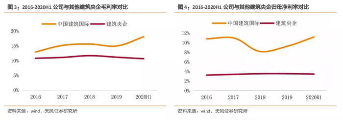 公司的盈利能力一直优于同业,2020年上半年公司毛利率为18.10%,较8家建筑央企高出7.44个百分点;归母净利率为11.20%,较8家建筑央企高出7.75个百分点。我们认为,造成公司高盈利的主要原因有:1)公司在内地大多从事基建投资业务,凭借“央企+外资”的双重背景,在内地具有较强的议价能力,能够选择具备更高盈利能力的项目,而内地建筑央企业务多以建筑承包为主,导致公司在内地的毛利率高于央企平均水平。2020年上半年公司在内地的营收占比为50%,而毛利占比高达76.4%;2)公司体制优势明显,市场化程度高,成本管控优良,因此费用率相对较低,得以保持高的盈利水平。