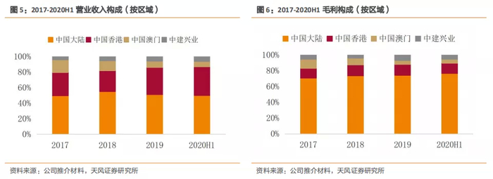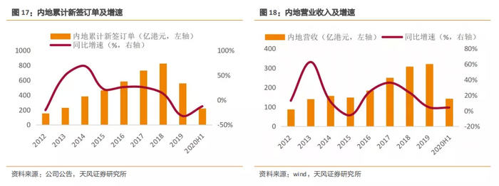 公司在内地业绩和订单常年保持高增速,2012-2019年营收复合增速为20.76%,新签订单复合增速为20.53%。2019年公司在内地营收、新签订单增速分别为4.29%、-32.35%,主要系公司主动调整经营结构所致。公司从规模增长与杠杆、现金流相平衡的策略出发,压低长周期项目订单比例,积极获取短周期、快周转的项目,进一步优化订单结构。2020年上半年内地新签订单214.6亿港元,同比下降12.7%,其中第二季度新签订单175.4亿港元,同比大幅增长107.4%。截至2020年6月30日,内地在手订单1616.7亿港元,是2019年营收的5.06倍,且项目周期继续缩短,周转逐步加快。