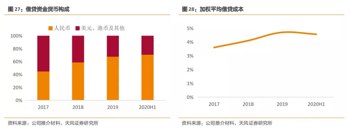 公司凭借央企和外资的双重背景,具有境内外双通道融资平台,中港两地的资金流通更加灵活。近年来随着内地融资环境的边际改善,公司融资逐渐向人民币资金倾斜。截至2020年6月30日,借贷资金中人民币占比上升至71%。2020年7月27日,公司首次涉足内地资本市场,成功发行20亿元人民币熊猫债,票面利率为3.48%,利率水平较低。