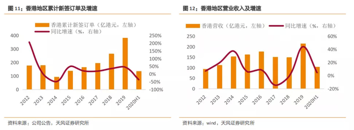 公司香港地区业绩较为稳健,2020年上半年,公司在面对经济下行压力与卫生事件的冲击下,积极推动各类政府工程落地,实现营收102.91亿港元,同比增长4.57%。近年来公司在香港地区新签订单保持较高增速,2020年上半年受卫生事件影响有所放缓,累计新签合约额134.3亿港元,继续保持市场龙头地位。截至2020年6月30日,香港地区的在手订单达571亿港元,同比增长25.74%,是2019年营收的2.67倍,对未来香港地区业绩形成支撑。