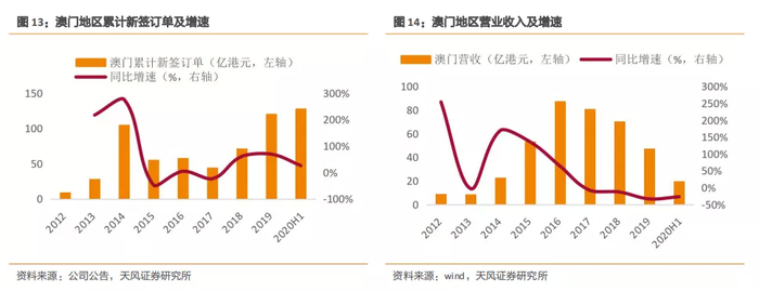 2017年以后公司在澳门地区业绩有所放缓,或因新建工程有所减少。2020年上半年实现营收19.47亿港元,同比减少26.67%。不过近年来澳门地区新签订单依旧保持较高增速,2020年上半年公司中标新濠影汇二期等大型项目,新签订单达127.5亿港元,创半年历史新高。截至2020年6月30日,澳门地区的在手订单达194亿港元,同比增长43.70%,是2019年营收的4.13倍,未来业绩增长有保障。
