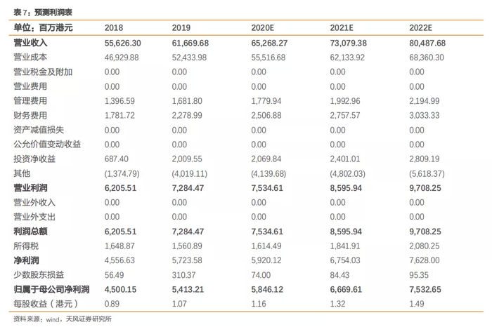 根据我们的预测,公司2020-2022年营业收入分别为652.68、730.79、804.88亿港元,分别增长5.84%、11.97%、10.14%;归属于母公司净利润分别为58.46、66.70、75.33亿港元,分别增长8.00%、14.09%、12.94%。