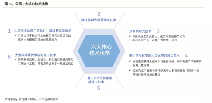 公司强化六大核心技术优势,这些优势对获得优质项目、提高盈利能力、节约资金成本、加快周转等方面发挥了重要作用。其中,公司在装配式建筑、医院和酒店施工的技术方面优势明显,提高了建筑项目的利润率和投资回报率。