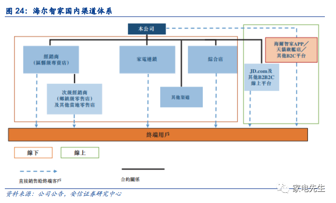 海尔具有多元化的渠道布局。线下渠道包括专卖店体系、家电连锁、综合店以及其他渠道(主要为向房地产商的销售),线上渠道由以京东为代表的B2B2C模式和以天猫为代表的B2C模式组成。