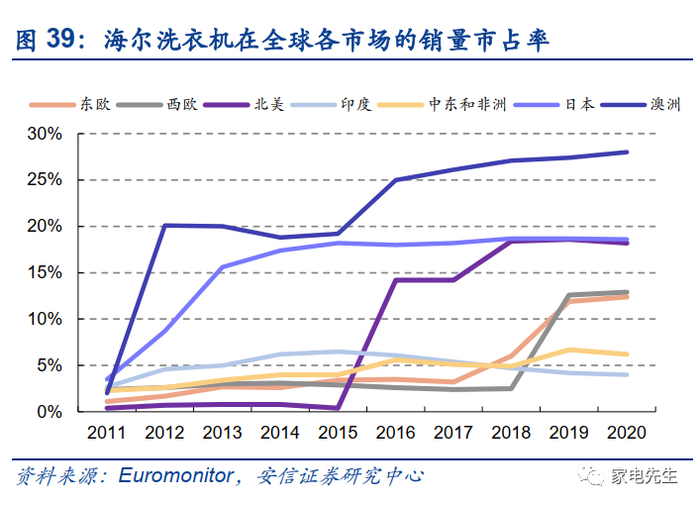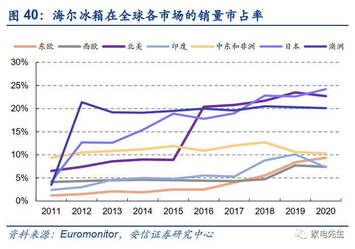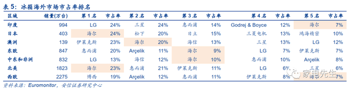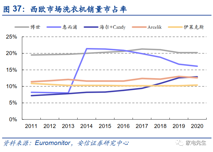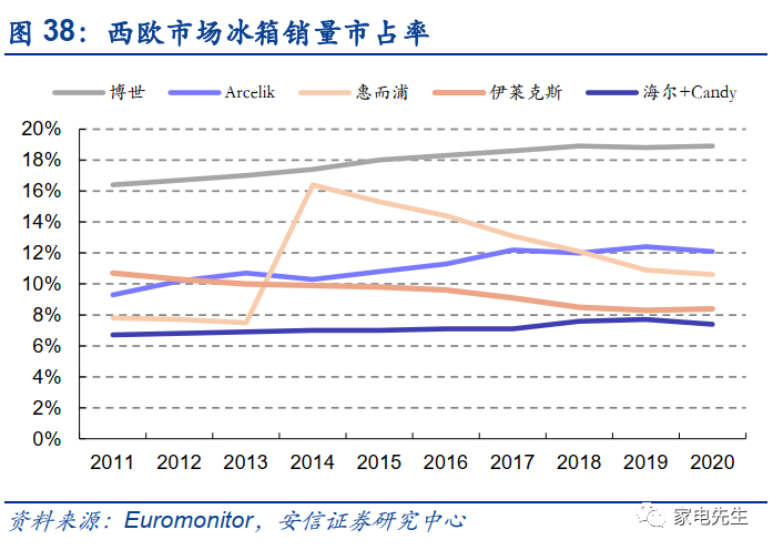 海尔在欧洲市场潜力较大,海尔收购Candy后,在西欧市场的冰洗市占率已提升至前5,与竞争对手间的份额差距较小。在国内市场,海尔的冰洗不断挤压外资的份额,高端品牌卡萨帝持续帮助海尔实现产品领先。在西欧市场,冰洗的产品形态和国内相似,我们认为,海尔仍然有能力通过产品的技术和性价比优势扩大在西欧市场的份额。此外,海尔将在欧洲进一步扩大产能布局,未来对于渠道的响应速度也将进一步加强,市场份额有望进一步提升。