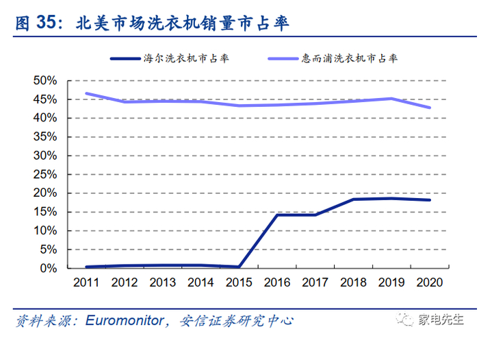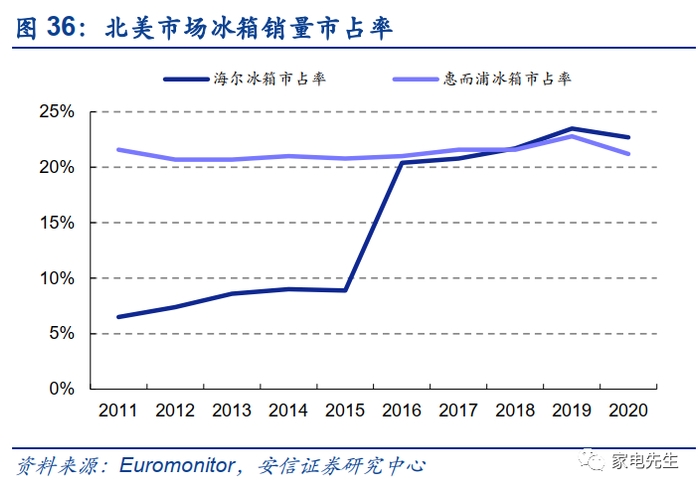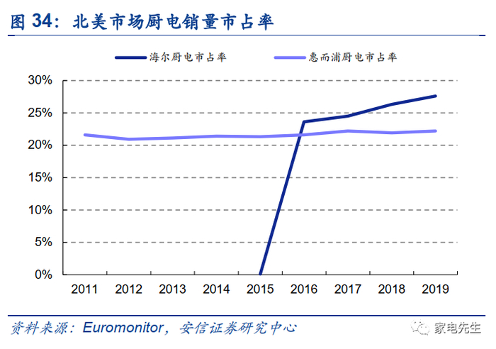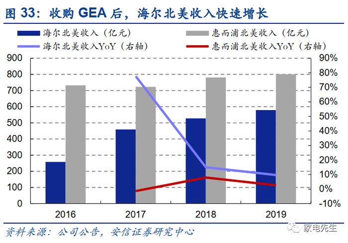 海尔通过一次次成功的海外并购整合,证明了海尔在海外并购方面,具有实现1+1>2的协同效应的能力。GEA在被海尔并购之后,厨电、洗衣机、冰箱的市场份额快速提升,拉动收入规模快速增长,海尔北美市场收入2016~2019年CAGR为30.9%,同期惠而浦在北美市场收入的CAGR为3.0%。我们认为,GEA在北美市占率的快速提升主要来自海尔对其产品和管理理念的赋能。当前海外家电市场品牌格局相对固化,海尔在产品创新以及组织创新方面具有独特的优势,帮助海外传统家电品牌释放活力。