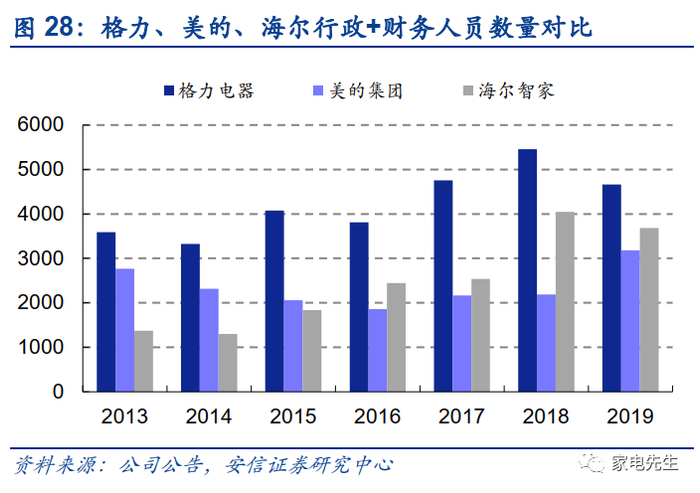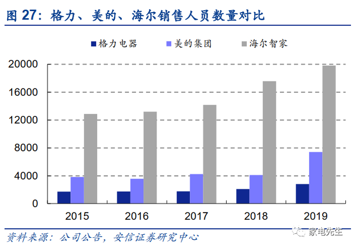 与格力、美的相比,海尔的销售人员数量较多。其背后主要因素为海尔的42个小微公司人员均为海尔表内的员工。42个小微公司为海尔的省级销售单位,相比之下,格力、美的省级代理商的工作人员均为非公司员工。