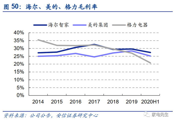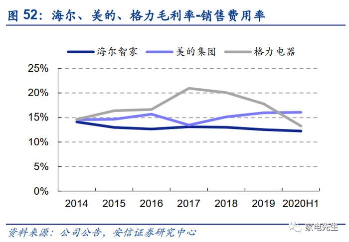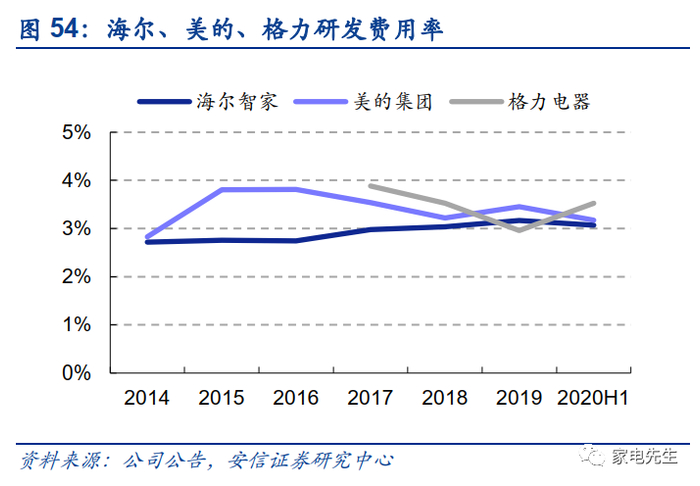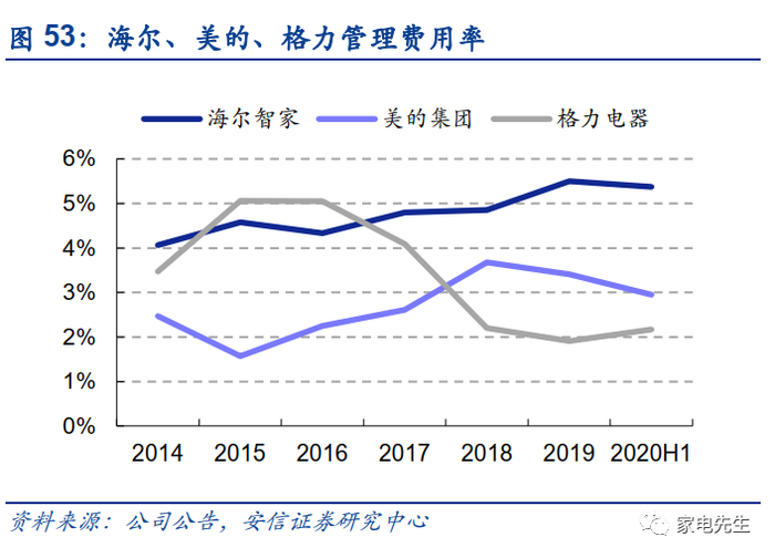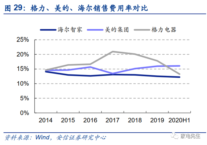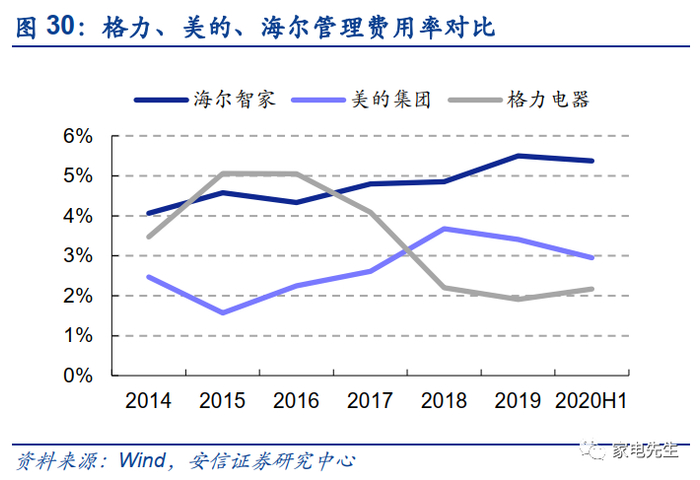 具体来看,海尔拥有表内渠道,导致其毛利率和销售费用率高于竞争对手。从毛销差的角度来看,2019年海尔毛利率-销售费用率为13%,低于美的(16%)、格力(18%)。此外,海尔的管理费用率保持在5%左右,而美的、格力的管理费用率为2%~3%,海尔的管理费用率与同行相比仍有较大的优化空间。