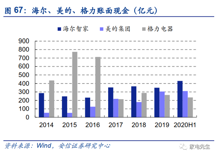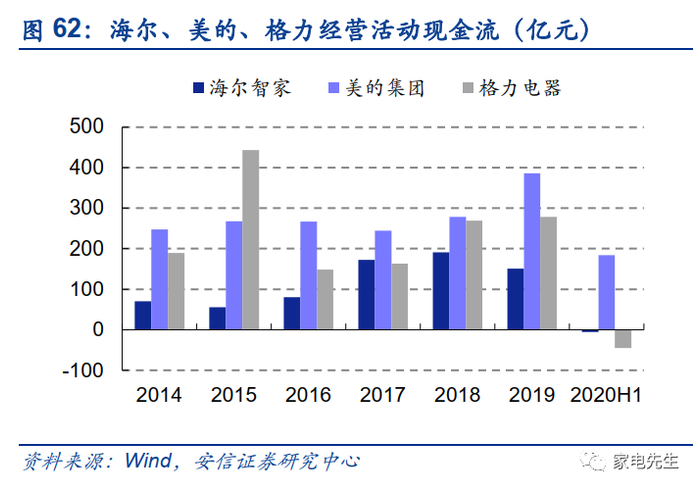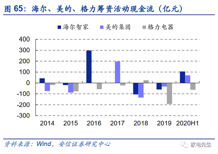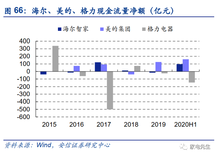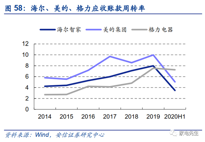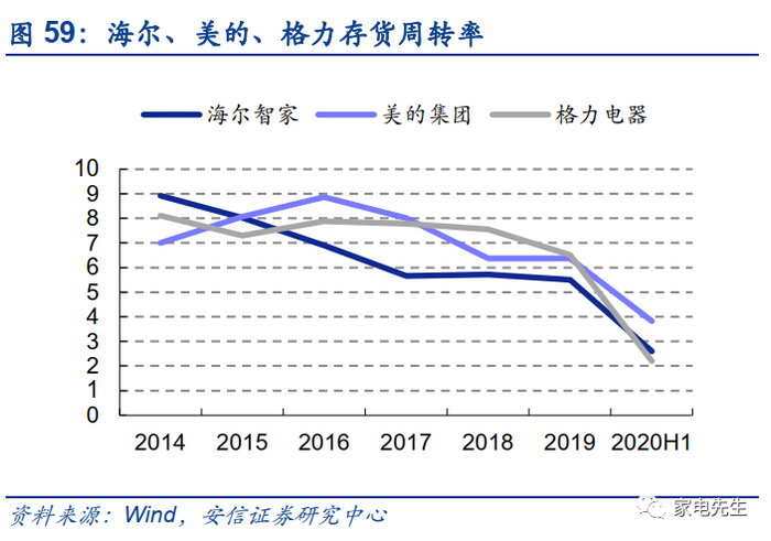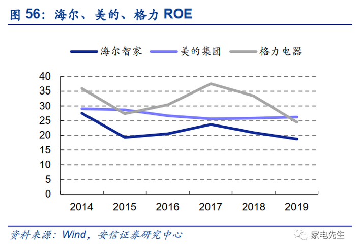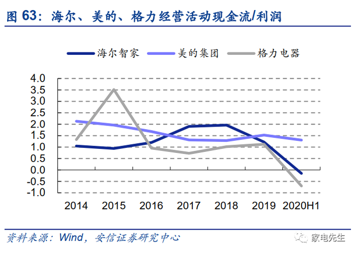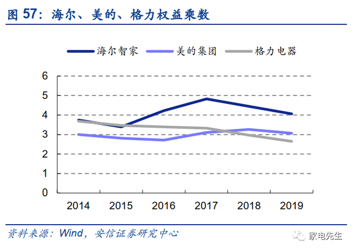 整体来看,海尔的ROE低于美的、格力主要因为利润率较低。2019年,海尔的ROE仅为19%,而美的、格力均在25%左右。从权益乘数的角度来看,海尔的经营杠杆并不低于美的、格力。从资产周转角度来看,海尔亦不逊于同行。