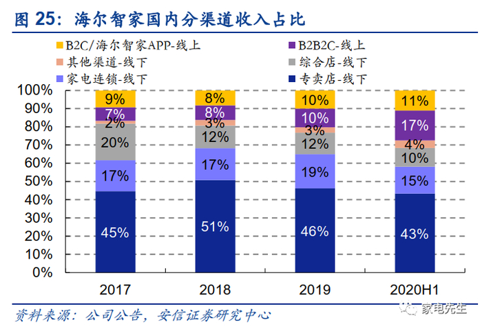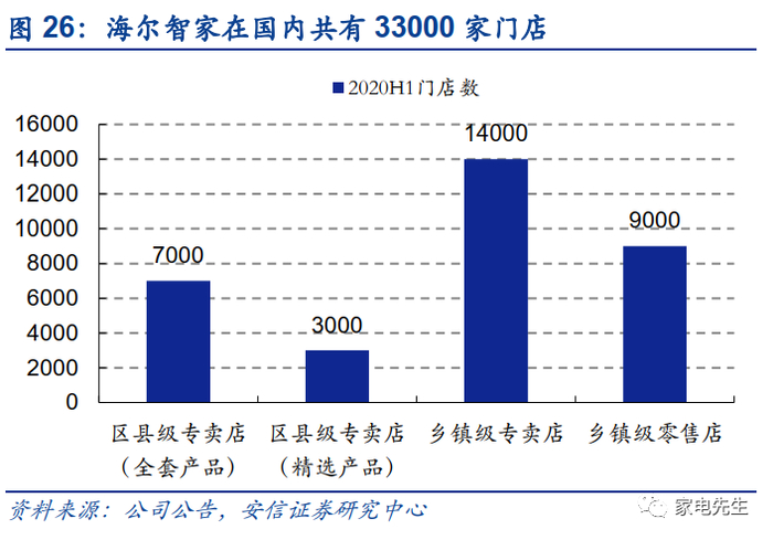 在海尔的国内渠道体系中,专卖店体系占最大份额(2020H1专卖店体系收入占国内收入的43%)。截至2020年6月30日,海尔在中国拥有7000多家可提供全套智慧家庭产品及解决方案的区县级专卖店及3000多家以精选产品线为重点的区县级专卖店,发展了14000多家乡镇级专卖店及近9000家乡镇级当地零售店,共计拥有33000家门店。在专卖店体系中,海尔聘用区县级经销商,并赋予区县级经销商次级专营的授予权,从而区县级经销商可以聘用次级经销商,将海尔专卖店体系的销售网络扩展至乡镇级。我们认为专卖店渠道对于海尔有三大重要作用:1)品牌商能够及时对消费者偏好和市场需求变动做出反映;2)广泛的专卖店布局,可以帮助提升海尔品牌的知名度;3)因为公司具有独立的专卖店体系,对于家电连锁等大型渠道商的依赖程度较低,在和大型渠道商谈判时拥有更强的灵活性。