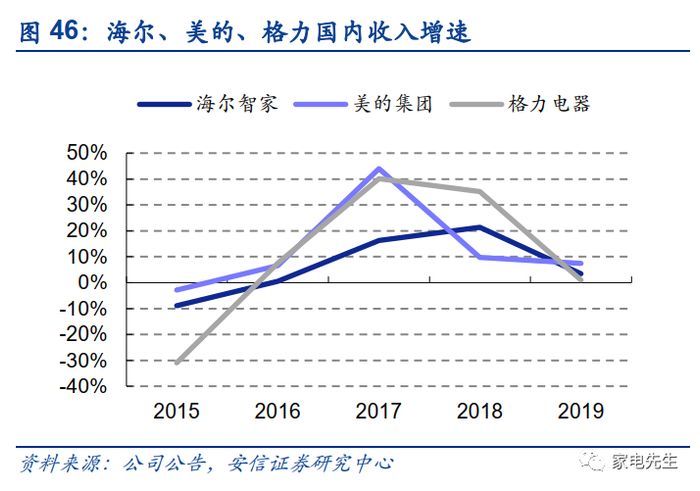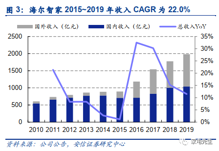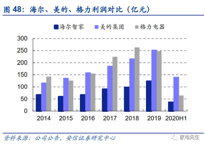 2015年以来,海尔的收入增长情况整体不逊于美的、格力,始终保持每年10%以上的增长。海尔的收入增长保持强劲势头的主要原因是其海外收入高速增长,海尔2015年开始大规模并购海外资产,拉动2015~2019年海尔的海外收入CAGR达50%,而美的、格力分别为24%、12%。同时期,海尔国内收入CAGR为10%(美的、格力分别为16%/20%)。