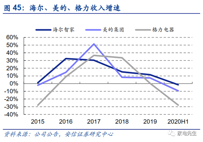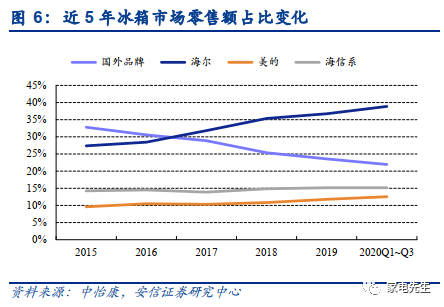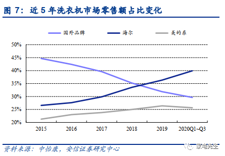 海尔冰洗龙头地位稳固,份额仍有提升空间。海尔在冰洗领域市场地位强势,市占率长期处于行业第一。根据中怡康数据,2015~2019年海尔冰箱零售额市占率提高9.4pct至36.7%,洗衣机零售额市占率提高9.8pct至36.3%,相比美的份额增速更快(2015~2019年冰箱零售额市占率提高2.2pct至11.8%,洗衣机零售额市占率提高5.1pct至26.4%)。2020H1,公司冰箱线上、线下零售额份额分别达到35.0%、38.5%,洗衣机线上、线下零售额份额达到39.3%、39.2%,冰洗龙头地位稳固。国内冰洗市场格局较为稳定,未来海尔将通过挤压国外品牌的份额实现市占率进一步扩张,根据中怡康数据,2019年,国外品牌在冰箱、洗衣机市场上零售额占比分别为23.6%、31.9%,海尔仍有进一步提高市场份额的空间。